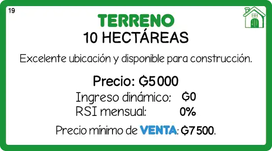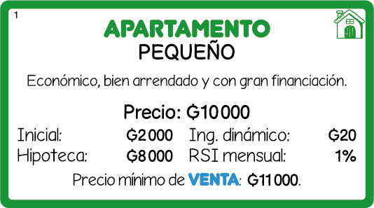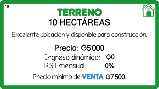 - Hipoteca: financiamiento ofrecido por el RINOBANCO. El pago de esta Hipoteca está calculado en la tarjeta y no guarda relación con tu capacidad de crédito; además, no es necesario registrarlo en tu hoja de juego.