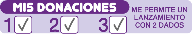 - Una vez que hayas completado tres donaciones, podrás realizar un lanzamiento con dos dados para mover tu ficha en el tablero, uno morado y otro amarillo. Cuando hayas utilizado este beneficio, borra todas las donaciones y repite el proceso para obtener el beneficio nuevamente. No podrás acumular más de tres donaciones.