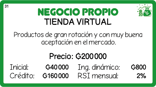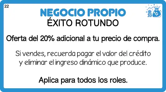 El NEGOCIO PROPIO tiene un precio de G200.000. Si le sumas el 20% de la oferta actual, obtendrás el precio de venta de G240.000. Si decides vender, a este valor deberás restarle el crédito de G160.000 para obtener la ganancia de $80.000 que podrás tomar del RINOBANCO. Recuerda borrar los datos de la tarjeta vendida en tu HOJA DE JUEGO y eliminar el Ingreso Dinámico que produce.
