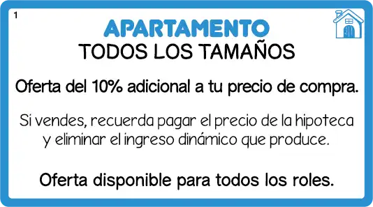 Si se trata de una venta, deberás liquidar el valor de tu ganancia aplicando las condiciones de la venta y restando el valor de la hipoteca o el crédito, además de actualizar tu HOJA DE JUEGO eliminando el activo, actualizando el tiempo y ajustando tu Estado de Resultados si fuese el caso. - COMISIONES: quien se beneficie de la tarjeta de VENTA, pagará una comisión del 1% del total de la venta o del beneficio total obtenido antes de pagar el crédito o hipoteca de cada tarjeta de OPORTUNIDAD que logre negociar. El mínimo valor de comisión permitido es de G1.000.